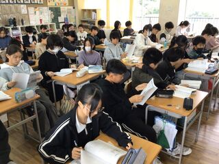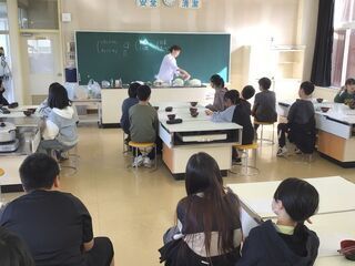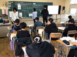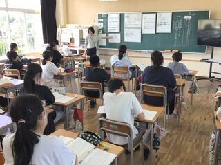 理科の授業でした。地層の学習です。がけの地層は、どのようにしてできたのかを考えていました。自分で調べたり、グループで話し合ったりしたのでしょう。黒板には、水の働きで色や粒の違う砂や石などが流されてきて、積もったことなどが書かれていました。実際に実験して確かめたり、校外学習で地層の見学に行ったりするようです。