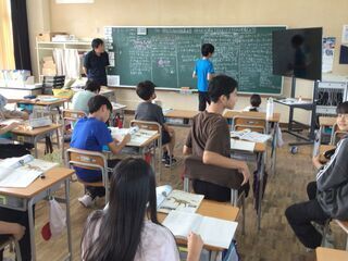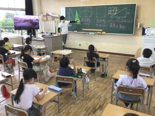 「体積」の単元は、学年を2つのグループに分け、算数の学習をしています。直方体や四角柱の体積を求めることを通して、「体積=底面積×高さ」で求められることをまとめました。「底面が三角形なら?」の教師の問いに、「公式に当てはめれば求められそう。」とどんどん学習が深まっていきます。「式は違うけど答えは同じ」ことから、式の意味を考えていくようです。