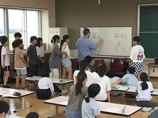 「やまなし」の学習を終え、宮沢賢治の生き方や考え方について考えていました。宮沢賢治は、童話作家として有名ですが、故郷の岩手県で教師・農業指導者・技師としての活動を続けていたことでも知られています。班ごとに話し合われた内容がホワイトボードに書かれてあり、「人間らしさを大切にしている」などと記されていました。宮沢賢治の生き方を知ると、「やななし」もさらに味わい深くなりますね。