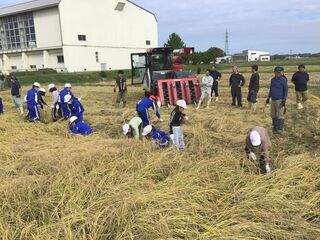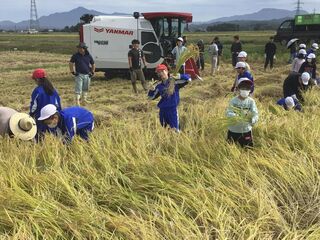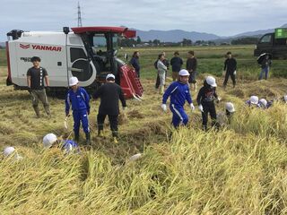 子どもたちが水分補給をしている間に、最新型のコンバインの登場です。見る見るうちに稲は刈り取られ、1時間ほどの作業で稲刈りは終了しました。