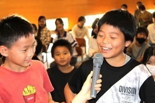4年生は、とってもシリアスでまじめな内容を、コミカルな劇にまとめて発表しました。社会で学習した水やごみの問題、総合的な学習の時間に学んだ福祉学習。みんなが幸せで豊かな生活をしていくために必要なこと、他者を思いやることが大切なことを、真剣にそしてユーモアを交えて発表しました。