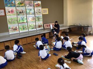 図工室で、わくフェスで展示した絵画作品の、鑑賞をしていました。虫の形や色の塗り方など、友達の作品のよい所やお気に入りの所をワークシートに書いていました。1年生にとっては、2年生以上の作品すべてが、上手に見えたことでしょう。「あんなふうに描きたいなあ。」という気持ちが、次の作品につながるはずです。