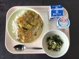 麦ごはん 牛乳 秋野菜のツナカレー 青大豆とワカメのサラダ ヨーグルト