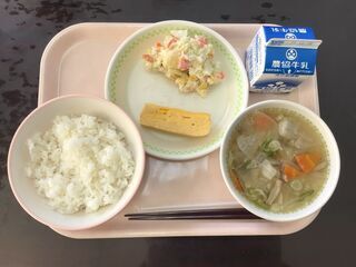 ごはん 牛乳 厚焼き玉子 ポテトサラダ メギスのつみれ汁