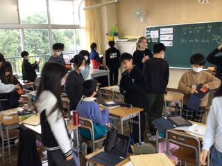 英語専科の吉岡先生、ALTのサシャ先生との外国語の授業でした。英語で、先生クイズを作っていました。そういえば、少し前に「What can you do?」と、先生方にインタビューをしていました。水泳やダンスなど、先生方のできることや苦手なことでクイズを作るようです。人柄も紹介するようですが、紹介される方は、ちょっとドキドキします。