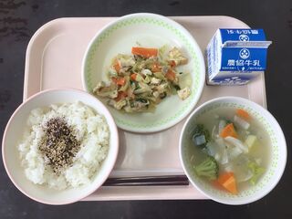 ごはん 牛乳 手作りゆかりのふりかけ 厚揚げとキャベツのみそ炒め 塩こうじポトフ