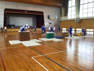 体育の授業で、走り幅跳びの練習をしていました。グラウンドの砂場は雨で湿っているので、体育館での練習です。両手を挙げて、高く跳べるように繰り返し練習していました。片足で踏み切り、両足で着地するのが、結構難しいようです。少しずつ、コツをつかんでいるようでした。