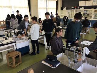 <6年2組>理科室で、実験をしていました。「てこ」の学習です。実験器具を使い、左と右がつり合うように、おもりをぶら下げるのです。子どもたちは、「つり合うためには、何か決まりがあるはずだ」と実験を進めていきます。「右の5の所に、重りを1つぶら下げた時は…」と考えながらつり合わせようとしますが、なかなかうまくいきません。つり合う時のきまりが見つかるといいです。
