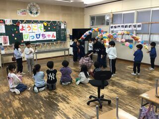 花のアーチをくぐって「ぴっぴちゃん」が入場すると、みんなが一斉に身を乗り出しました。大きな拍手で迎えたいのですが、びっくりさせないように、小さな拍手で迎えました。歓迎の言葉を発表したり、プレゼントの餌をあげたり、手づくりの気持ちのこもった入学式でした。かわいらしくて撫でてあげたいような、でも初めてなのでちょっぴり怖いような、いろんな気持ちが入り混じった入学式でした。