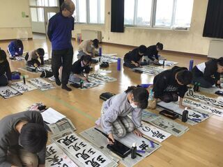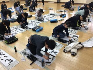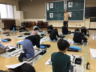 今年も、書初めの時期がやってきました。視聴覚室から、墨汁の香りが漂ってきます。今日は、地域の書道家としても有名な、瀧本様から講師として来ていただき、全校のトップバッターとして、1・2時間目に4年生が書初め練習を行いました。驚いたのは、筆の手入れがよいことです。太筆の毛がふさふさとしていて、まるで新品の筆のようでした。