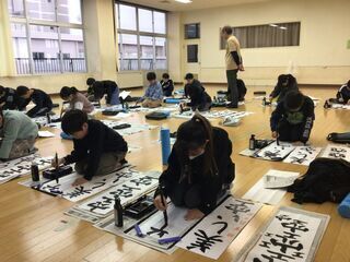 一文字ずつの練習を重ね、最後に2枚「美しい空」を仕上げました。さすがに4年生の集中力も高まり、凛とした空気が視聴覚室を包みました。たった2時間でみるみる上達したことに、子ども自身も驚いたことでしょう。3学期の校内書初め会に向けて、冬休みの課題としても取り組みます。校内書初め展で、どんな力作が並ぶか、今から楽しみです。