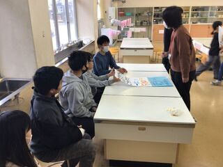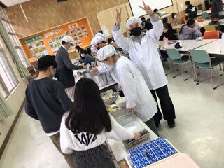 昼休みになると、宣伝係の子どもが職員室や教室にいる職員に、発酵鍋の宣伝に行きます。調理員さんの所にも宣伝に行ったようです。家庭科室に行くと、5年生が「いらっしゃいませ!」と歓迎してくれます。会計係や、案内係もスタンバイしています。デリバリーにも、対応してくれたようです。会食中は、「味はいかがですか?」と接客にも来てくれます。「この発酵鍋の『うり』は何ですか?」と聞くと、「オリジナル巾着」の説明をしてくれます。一人一人に役割があり、チームワークよくお店を開いていました。