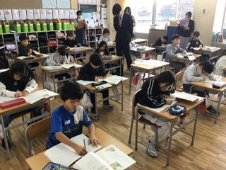 一人で練習したり、自由に教室を歩きながら友達と練習したり、中には担任に聞かせてあげている子どももいました。恥ずかしがっていた子どももいましたが、ひとりひとりの「ああ。」「とてもいいお手紙だ。」が完成したようです。振り返りの時間は、iPadを使って、友達の感じたことと比べながら、今日の学習をまとめました。新しいiPadの活用の仕方は、職員でも共有したいと考えています。