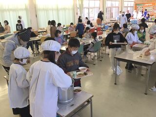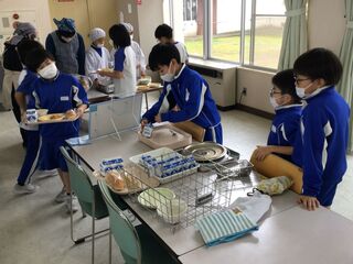 毎週月曜日と水曜日は、教育実習で5年生を担当していただいた内山先生が、ボランティアで教育活動を支援してくださっています。給食も、5年生と一緒です。気心の知れた、内山先生と一緒に給食を食べると、給食が一層おいしく感じますね。調理員さん、サツマイモは甘みが強くおいしかったです。なめこの味噌汁は、身体が芯からあたたまりました。