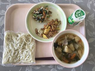 <今日の献立>ゆでうどん 発酵乳(マスカット) 子ぎつね汁 のり酢和え こんこんスナック
