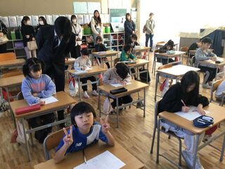 外国語の授業でした。何をしているのか、子どもに聞いてみると、グループで「街」を作っているのだそうです。英語で、お買い物を楽しむ時間のようでした。「What would you like?」「I like~」などの話型を使い、自然に英会話に親しんでいました。「GOMA」という架空の紙幣もあり、すべての物が「100GOMA」で売られていたので、思わず笑顔になりました。