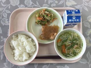 <今日の献立>ごはん 牛乳 鶏肉の唐揚げ おろしポン酢ソースかけ 小松菜のごま味噌和え だしを味わう秋のすまし汁