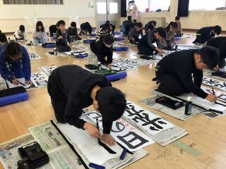 <6年1組>1~2時間目に、書初め練習をしました。昨年は「将来の夢」でしたが、今年はお題が変わり「夢の実現」です。画数が多く、文字の形を整えることはもちろんですが、太く大きく力強く書くことが、なかなか難しいようです。一画ずつ、きちんとお手本を見ながら、慎重に筆を運ぶ子どもが多かったです。夢が実現するよう、思いも筆にのせて書きました。