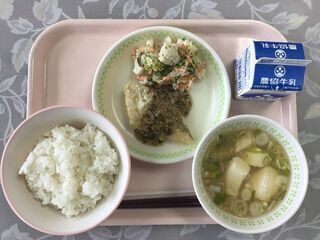 <今日の献立>ごはん 牛乳 鱈の塩だれかけ 花野菜のゆかりマヨ和え おぼろ汁