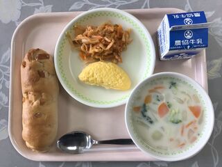 <今日の献立>アップル米粉パン 牛乳 オムレツ 切り干しナポリタン さつまいもクリームスープ