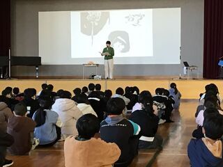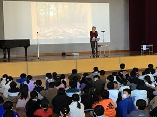 今日は、「ゆず」「でんしゃのまどから」「ほっほっははは!」「かぜのでんわ」の4作品を読んでいただきました。懐かしいハーモニカの生演奏も聞かせていただきました。作品によって、声を変え、読む速さを変え、身振り手振りを付けてと、様々な読み語りをしてくださいました。子どもたちは、あっという間に読み語りの世界に引き込まれていきました。