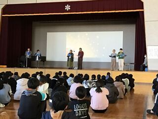 1年生は、生活科で飼育したいろいろな虫を紹介しました。沖縄県では、ヘラクレスオオカブトが採れるのだそうです。1年生は、大きな歓声を上げていました。5年生は、米づくりについてのクイズを出しました。坂口謹一郎博士の紹介や、自分たちが取り組んでいる発酵鍋についても発表しました。