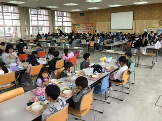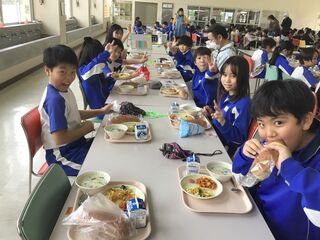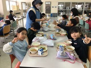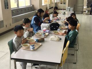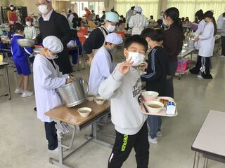 1年生も、牛乳とストローをお盆にのせたり、主菜や副菜を自分で盛り付けたりしています。トングの使い方も、上手になりました。何事も、経験が大切です。家庭でも、大人がやってあげるだけでなく、やり方を教えたり一緒にやってみたりして、子どもにたくさん経験させてください。「ありがとね。」「助かったよ。」と声をかけると、たくさんお手伝いをしてくれるはずです。