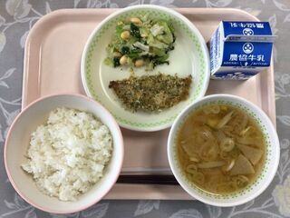 <今日の献立>ごはん 牛乳 サメの和風香りパン粉焼き 塩こうじ和え 頸城の野菜たっぷり味噌汁