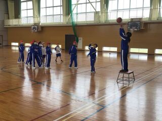 <4年生>新しい種目の、ポートボールの練習が始まったようです。ガードマンとゴールマンを決めて、シュート練習をしていました。これから、パスやドリブルの練習もしながら、ゲームを楽しむのでしょう。チームワークも、どんどん高まっていくといいです。今の遊びの中には、「投げる」経験が少ないと感じます。たくさん練習して、投げる力も付けてほしいです。