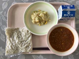 <今日の献立>米粉麺 牛乳 ごま味噌担々麺 わかめの中華和え ゆかり豆