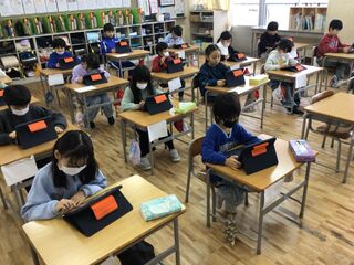 <2年1組>教室はシーンと静まり返り、物音ひとつしません。移動教室かと思いましたが、iPadで九九の復習をしていました。のぼり九九やくだり九九、ばらばら九九と、自分の挑戦したい九九を選び、集中して学習していました。時間を設定してクリアを目指している子どももいました。私が、教室に入ったことにも気付かずに、夢中になっている姿に驚きました。