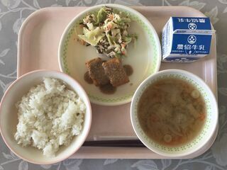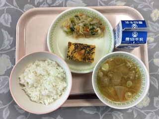 <今日の献立>ごはん 牛乳 厚揚げとキャベツのごまみそ炒め 青のりポテト ワンタンスープ