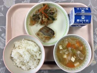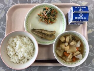 <今日の献立>ごはん 牛乳 鱈の味噌マヨネーズ焼き 大根のきんぴら 里芋豚汁