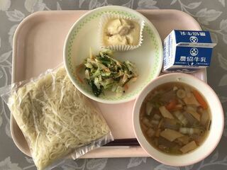 <今日の献立>ソフトめん 牛乳 ビーンズミートソース コロコロサラダ