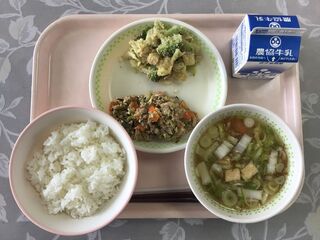 ツナそぼろ丼には、ツナ、ひじき、大豆、玉ねぎ、にんじん、小松菜が入っていました。味だけでなく、目でも楽しめる献立でした。ツナの旨味がごはんにまで染みて、思わずおかわりしたくなるおいしさでした。彩りがよいと、おいしさも2割増しになります。調理員さん、味だけでなく彩りまで考えて調理してくださり、ありがとうございました。