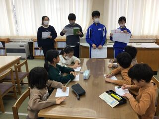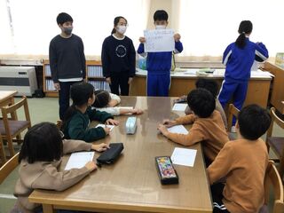 昼休みは、図書委員会が3・4年生に図書クイズ大会を開きました。今日は、中学年が体育館で遊べる日だったため、6人の3・4年生が参加しました。図書委員会は、「ことわざブック」「日本の発明品」「お金の秘密」「月のかがく」などの本から、3・4年生のためにクイズを考えてくれました。3・4年生でもわかりそうな問題や、答えが分からなくても楽しめる問題を考えたようです。