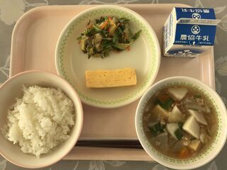 和食のように、ごはん、主菜、副菜、汁物とそろえるのは、日々の忙しさの中ではなかなか難しいものです。栄養面や季節感、彩りまで考えるとなると、なおさらです。時間に余裕があるときなどは、意識して和食を心がけたいものです。今日の給食は、「体の調子を整えるもの」だけでも、9種類の食材が使われていました。調理員さん、ありがとうございました。