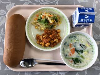 <今日の献立>黒糖パン 牛乳 チリビーンズ カラフルサラダ 白菜のクリームスープ