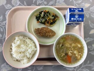 ご存じの通り、給食は薄味(減塩)でもおいしく食べることができるように、様々な工夫をしています。今日の子ぎつねスープは、昆布からおいしい出汁が出ていました。豚肉と油揚げのおいしさもスープ全体に広がって、とてもおいしかったです。こんこんスナックは、揚げたごぼうも入っていました。カリカリっとした食感で、おやつ感覚でいただくことができました。