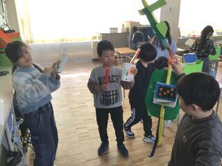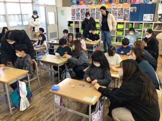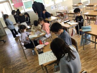 <2年2組>机の上には、学年だよりが配られていました。先日の、おでんパーティーの画像がたくさん載っていて、懐かしそうに思い出しながら笑顔で見ていました。学習用具の、整理整頓もしていました。音楽で作った、手作りのギターを片付けようとしていたら、いつの間にか音楽会が始まりました。「見て見て!」「弾いてみて!」と何人もの子どもが、そばに来てくれました。