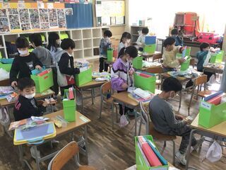 学習用具の、整理整頓をしていました。教科書に粘土ケース、粘土板、算数で使った時計やおはじきのセットなどを、一つずつ順番にしまっていきます。きちんと片付けるのは、1年生にとってはなかなか難しいことですが、こうやってきれいにしておけば、3学期に気持ちよくスタートできそうです。