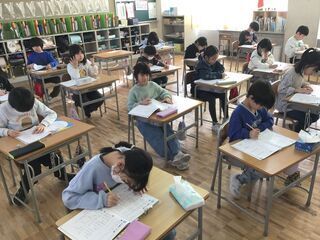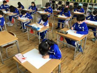 人が書く字には、知らず知らずのうちに人柄や性格、個性が表れると言われています。子どもたちは、新年の喜びや希望、3学期にかける意気込みなど、今の自分の気持ちを一文字一文字に思い切り詰め込んで書きました。そして、書初め会独特の緊張感の中、丁寧に伸び伸びとした作品に仕上げました。