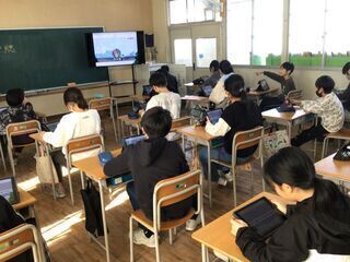 <6年1組>お楽しみ会をしているはずなのに、みんな正面を向いてiPadを操作しています。「何の時間?」と聞くと、「お楽しみ会」と即答されました。子どもが、iPadでクイズのようなゲームのような、オリジナルの企画で楽しんでいました。黙々とやっているかと思えば、一瞬歓声が上がったり、立ち上がってガッツポーズをしたり。お楽しみ会も、「現代版」になってきているようです。作った子どもの将来は、プログラマーでしょうか。