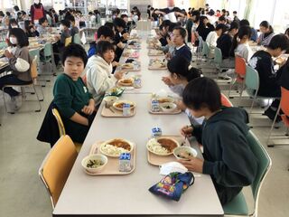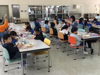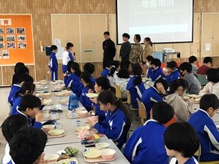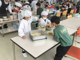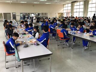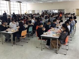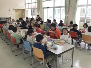給食の時間、スペシャルゲストとして、給食に野菜を提供していただいている「野菜クラブ」さんと「ふぁーむ大地」さんをお招きしました。そして、子どもたちと一緒に新鮮、安全でおいしい食材で、調理員さんが作ってくださった給食を食べていただきました。給食委員会代表の子どもからは、感謝の言葉が述べられました。いつもよりおいしく、感謝の気持ちも膨らんだ、今日の給食でした。