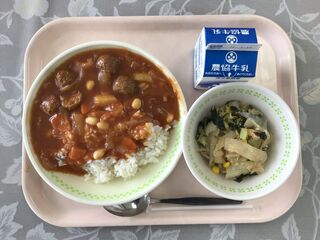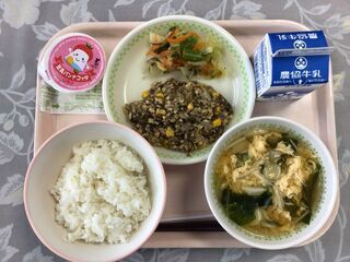 <今日の献立>麦ごはん 牛乳 ミートボールハヤシライス こんにゃくとワカメのサラダ