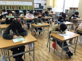 <4年生>4年生は、2学期の学習と生活を振り返っていました。一人一人が、自分のがんばったこと、できるようになったことを書いていました。学期の節目に、自分自身を見つめ、振り返ることは、大切なことだと感じます。成長した自分を振り返ることが、次のステップへの栄養になり意欲につながります。次の目標にもつながります。担任が作った、2学期の思い出ムービーも見たようです。