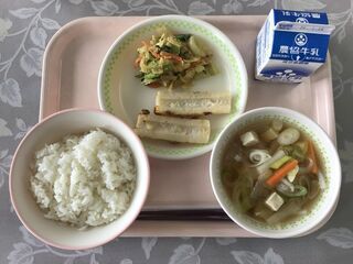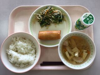 <今日の献立>ごはん 牛乳 ポテチー春巻き もやしのナムル 春雨スープ