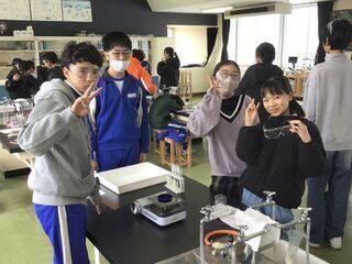 <6年2組>4時間は、理科室で実験をしていました。食塩水や炭酸水、うすい塩酸などの水溶液の性質を調べていました。前の時間は、見た目やにおいで水溶液の違いを調べたようです。今日は、蒸発させたときの変化を実験で調べていました。保護メガネをかける、アルコールランプではなくガスコンロを使う、実験器具もずいぶん変わったようです。