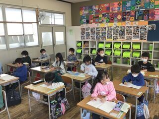 <2年2組>係活動の、ポスターを書いていました。日にち係や黒板係など、クラスの友達が気持ちよく過ごすことができるよう、係活動を行っているのです。みんなの役に立つ仕事、みんなが喜んでくれる仕事をする経験は、とても大切ですよね。ポスターを書かないプレゼント係は、折り紙で熱心にプレゼントを作っていました。きっと、もらった人の喜んでいる顔を想像しながら作っていたことでしょう。