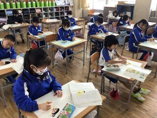 <2年2組>国語「詩」の学習です。たくさんある詩の本の中から、自分の好きな詩を選び、視写したようです。選んだ理由や、おすすめポイントなども、びっしりと書いてありました。挿絵を描いて、きれいに仕上げている子どももいました。友達同士で、おすすめの詩を紹介し合うのが楽しみです。